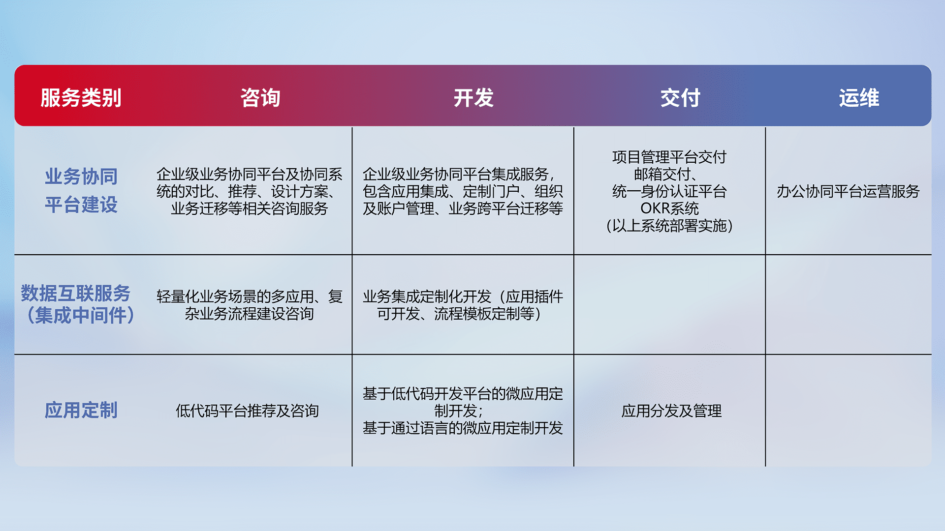 针对钉钉、、、企微、、、、IDaas等平台级产品提供产品的规划、、、、方案、、、、交付、、、定制化开发等服务,,实现如统一协同办公、、、、智能客户服务、、混合会议管理、、、智能数据查询、、、等业务场景,,实现数字化转型。。。
